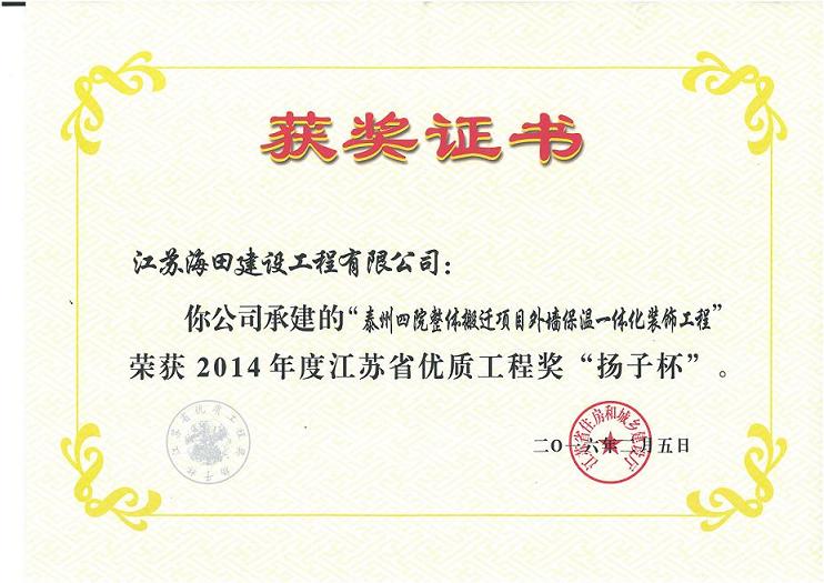 熱烈祝賀我司承建的泰州四院整體搬遷項目外墻保溫一體化工程被評為江蘇省優(yōu)質(zhì)工程獎“揚子杯”